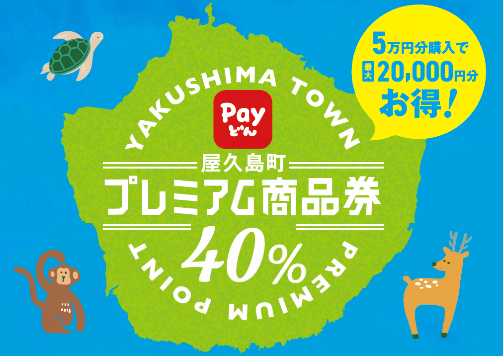 Payどんにて地域振興券(屋久島町プレミアム商品券)を購入すると、プレミアム分40%を上乗せした「屋久島町プレミアム商品券」ポイントが付与されます。